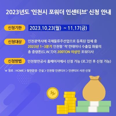 한편, IPA는 인천항 이용기업의 물류비 절감을 위해 2006년도부터 ‘인천항 인센티브 제도’를 운영하고 있으며, 전국 단위 선사·화주·포워더를 대상으로 하는 ‘2023년 인천항 인센티브’는 내년 1분기 중 별도 안내 예정이다.
