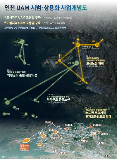인천시는 도심항공교통 체계를 도입하기 위해 적극적으로 사전 준비를 해왔고, 지난 5월 정부(국토교통부)의 한국형 도심항공교통 그랜드챌린지 2단계 도심실증 사업을 유치한 바 있다. 사업구간은 청라(드론시험인증센터) - 아라뱃길 – 계양신도시를 잇는 14km 구간으로 도심에서의 UAM 상용화를 위한 실증이 수행된다.