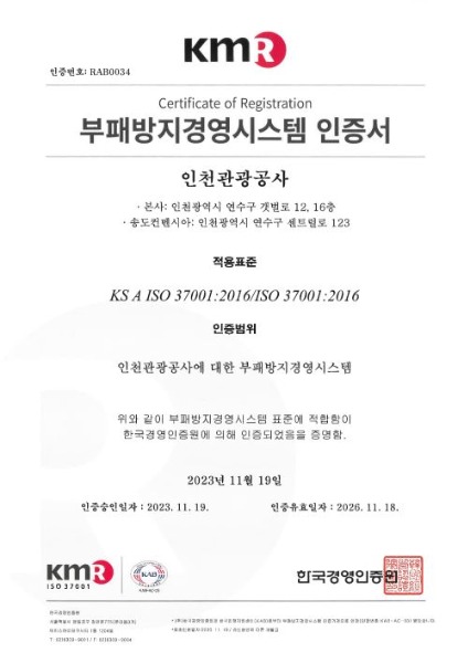 인천관광공사가 3년 연속으로 부패방지경영시스템(ISO37001), 안전보건경영시스템(ISO45001), 인권경영시스템 3개의 인증을 획득했다고 밝혔다.