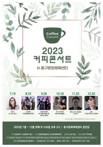 인천 동구문화체육센터는 오는 20일 오후 2시 인천문화예술회관과 공동으로 기획한 ‘커피콘서트’의 마지막 무대를 연다고 밝혔다.