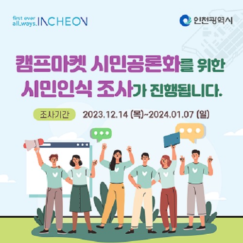 내년 1월 7일까지 부평구에 위치한 미군기지였던 캠프마켓을 공원으로 조성하기에 앞서, 시민의견이 반영된 공원조성 방향 수립을 위해 인천 시민의 전반적 인식을 파악하고, 그 결과를 공론화 과정에 반영하기 위해 실시한다. 캠프마켓 시민공론화추진단에서 조사방법과 표본 설계 등을 정해 진행한다.