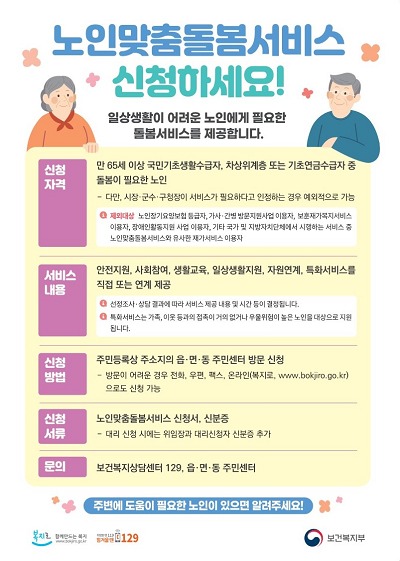 노인 맞춤돌봄서비스는 돌봄이 필요한 취약 노인을 대상으로 ▲안전지원(방문, 전화, 말벗) ▲사회참여(사회관계 향상 프로그램, 평생교육) ▲생활교육(신체 및 정신건강분야 생활교육) ▲일상생활 지원(이동활동 지원, 가사지원) ▲연계서비스(생활, 주거, 건강 등 연계) 등 개인별 욕구중심 맞춤형 서비스를 제공하는 돌봄서비스다.