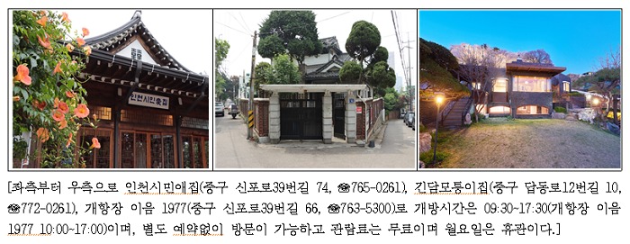 옛 시장 관사였던 ‘인천시민애집’과 ‘긴담모퉁이집’, 최초의 서구식 공원인 ‘자유공원’, 1970년대 김수근 건축가에 의해 탄생한 ‘개항장 이음 1977’ 등에 이르기까지 다양한 근현대건축물이 소재해 있다.