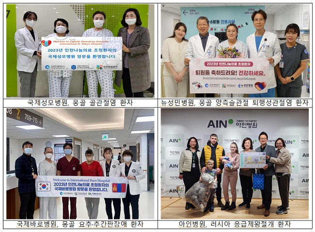 올해 인천나눔의료 사업에는 ▲가톨릭관동대학교 국제성모병원(몽골 골관절염환자 2명), ▲뉴성민병원(몽골 양측슬관절 퇴행성관절염 환자 1명), ▲국제바로병원(몽골 요추·추간판장애 환자 1명), ▲아인병원(러시아 응급제왕절개·신생아 호흡병태 환자 1명)이 동참하여 국제적인 사랑의 손길을 보탰다.