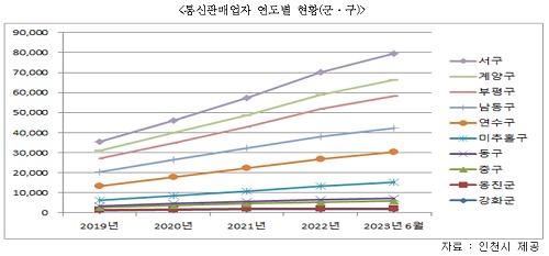 1일 인천시가 인천시의회에 제출한 10개 군·구별 통신판매업자 현황에 따르면 2023년 6월 기준 7만9천365곳으로 2019년 대비 124.6%가 증가했다.