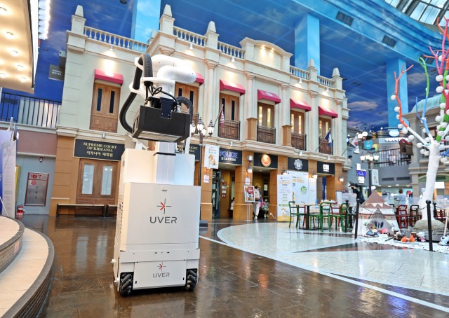 유버는 이번 계약을 통해 △인공지능(AI) 기술이 접목된 출입형 워크스루 로봇 △실내외에서 원격으로 자율 주행하면서 표면, 공기 등 공간 살균을 수행하는 로봇 △높은 천장까지 살균할 수 있는 로봇암 형태의 로봇 등 첨단 로봇 5종 및 로봇 방역 전문 인력을 투입해 1년간 키자니아 서울의 살균·소독을 책임진다.