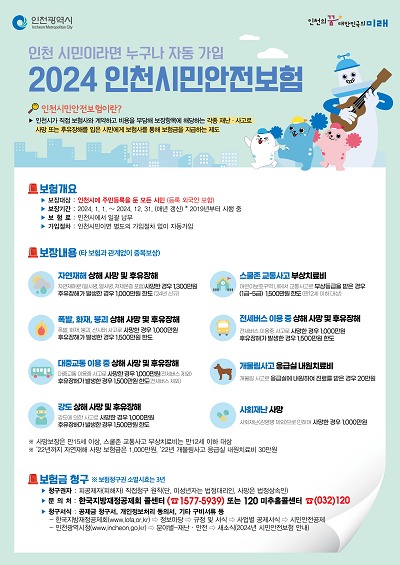 김성훈 인천시 시민안전본부장은 “재난이나 예상치 못한 사고 피해로부터 인천 시민의 삶을 보다 촘촘히 보호하고 지원하고자 2024년에는 자연재해 상해 후유장해 보장항목을 추가했다”며 “앞으로도 더 많은 시민들이 실질적인 혜택을 받을 수 있도록 시민안전보험을 지속 확대 운영해 안전 도시 인천을 만들어가는데 힘쓰겠다”고 전했다.