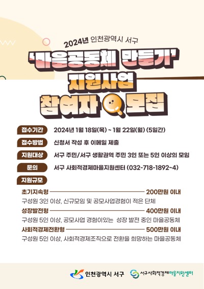 인천 서구청은 ‘2024년 서구 마을공동체 만들기 지원사업’에 참여할 공동체를 모집한다고 밝혔다.