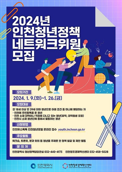 인천광역시가 청년정책 발굴과 청년과의 소통 활성화를 위한 ‘2024년 인천청년정책네트워크’위원을 공개 모집한다.