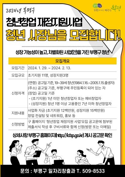 부평구가 오는 29일부터 다음 달 13일까지 2024년 ‘청년창업 재정지원 사업’의 참여자를 모집한다.