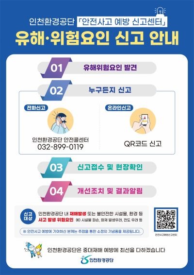 인천환경공단은 18일부터 환경기초시설 내 안전사고 위험요인 발굴 및 개선을 위한 ‘안전사고 예방 신고센터’ 를 운영한다.