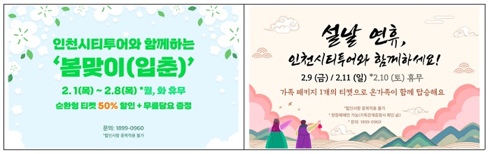 2월에는 봄맞이 할인 이벤트, 설날연휴 온가족이 함께하는 가족패키지(티켓 1장으로 온가족 탑승), 발렌타인데이 1+1 이벤트, 인천시티투어 입소문 이벤트 등 다양한 프로모션을 추진할 계획이다.