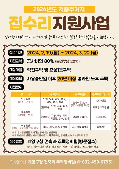 신청은 오는 2월 19일부터 3월 22일까지이며, 지원 신청서 등 서류를 갖춰 계양구청 건축과 주택정비팀으로 방문 신청하면 된다. 계양구는 서류심사, 현장조사, 집수리선정위원회 등을 거쳐 지원 대상을 선정할 예정이다.