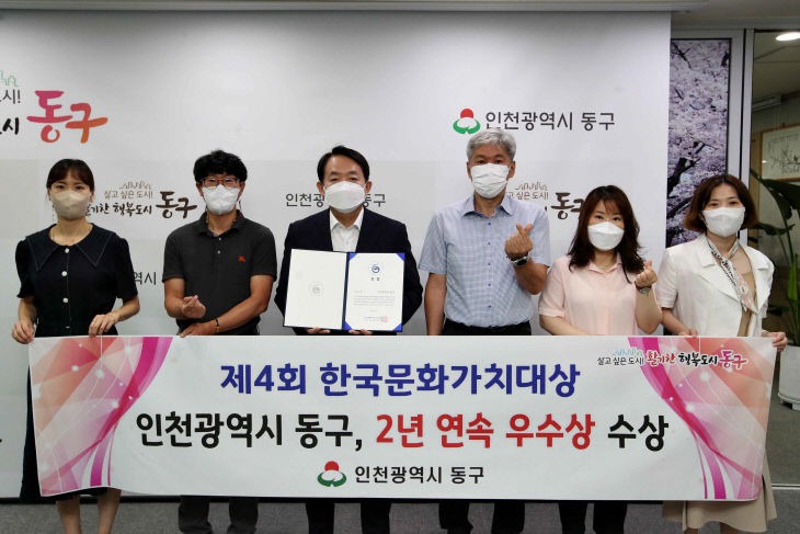 인천시 동구는 (사)한국문화가치연구협회(이사장 김명곤)에서 주관하는 '제4회 한국문화가치대상'에서 지난해에 이어 '우수상'을 수상했다고 22일 밝혔다.