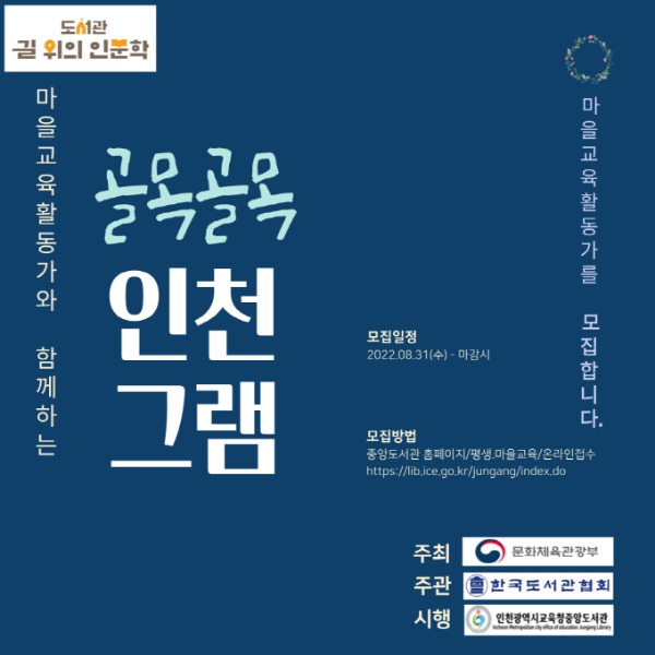 인천광역시교육청중앙도서관(관장 신명희)은 "문화체육관광부가 주최하고 한국도서관협회가 주관하는 2022년 도서관 길 위의 인문학 공모사업 「골목골목 인천그램」을 운영한다"고 밝혔다.