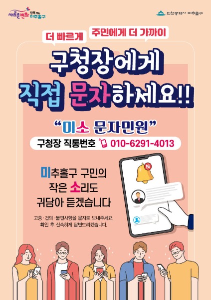 인천시 미추홀구는 9월 1일부터 인천시 최초 구청장 직통 문자민원 서비스 '미소 문자민원'을 운영한다고 밝혔다.