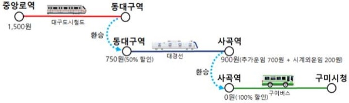 아울러, 대경선 개통에 맞춰 대구광역시와 경상북도가 확대 개편하는 대중교통 광역환승제에 광역철도도 포함돼 버스나 도시철도 등 다른 대중교통과 환승 때 기본요금의 50%를 할인받을 수 있다.
