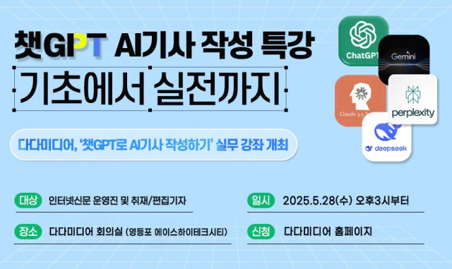 ‘생성형 AI 기사 쓰기’ 실전 특강은 오는 5월 28일(수) 다다미디어 본사 회의실에서 진행되며, 참가비는 3만 원이다. 참가 신청은 다다미디어 홈페이지(www.dadamedia.net)를 통해 선착순으로 접수받고 있으며, 자세한 문의는 전화로 가능하다.