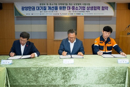 광양제철소가 지난 30일, 광양제철소 백운대에서 영산강유역환경청 · 광양시와 함께 환경부에서 주관하는 ‘대·중소기업 지역대기질 개선 상생협력 시범사업’ 상생협약을 체결하고 지역 대기질 개선을 위한 지자체 및 중소기업 간 협력체계 구축에 나선다.