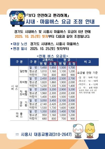 시흥시는 오는 10월 25일 첫차부터 경기도 시내버스 및 시흥시 마을버스 요금을 조정한다.