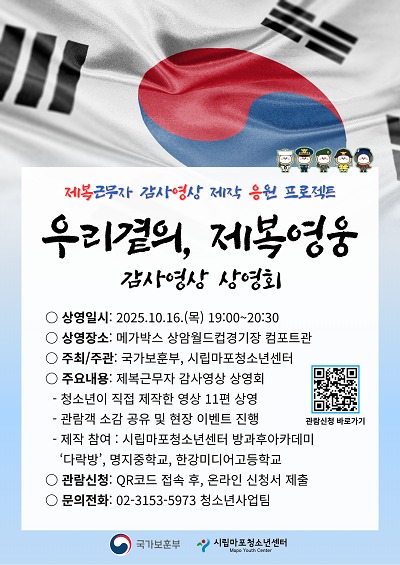 이번 상영회는 마포경찰서, 서울기동순찰대, 서대문청소년경찰학교 등 제복근무자도 함께 참석해 청소년과 영상을 관람하고 감사패를 수여받는 뜻깊은 자리가 될 예정이다. 시립마포청소년센터는 ‘우리 곁의, 제복영웅’ 상영회를 통해 보훈문화가 단순한 교육을 넘어 지역사회와 함께 실천하는 생활 속 가치로 확산되길 기대하고 있다.