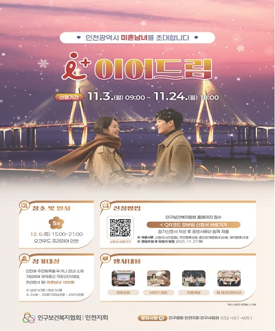 인천시와 인구보건복지협회 인천지회(회장 박규홍)는 인천 청년 미혼남녀의 만남을 지원하기 위해 5차‘아이플러스(i+) 이어드림’참가자를 오는 11월 3일부터 11월 24일까지 3주간 모집한다고 밝혔다.