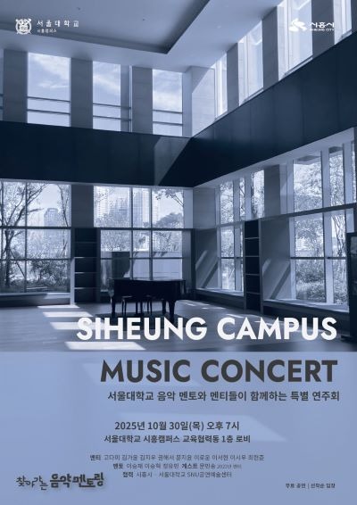 서울대학교 시흥캠퍼스와 시흥시가 협력하는 ‘서울대학교 음악 멘토-멘티 특별 연주회’가 10월 30일 오후 7시, 서울대학교 시흥캠퍼스 교육협력동 1층 로비(시흥시 서울대학로 173)에서 열린다.