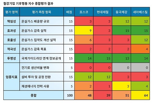 철강사 기후행동평가는 책임성(온실가스 배출량), 효과성(온실가스 감축률), 효율성(온실가스 집약도 개선), 적극성 (감축 목표), 투명성(정보 공개), 그리고 철강 업종 특성(전기로 생산비율, 저탄소 설비 투자 및 공정 전환 계획, 재생에너지 전력 사용)을 포함한 6개 영역에 대해 실시됐다.