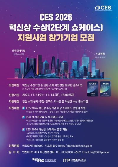 인천테크노파크(인천TP)는 오는 14일까지 CES 2026 혁신상을 수상한 기업들을 대상으로 ‘CES 2026 혁신상 수상(2단계 쇼케이스) 지원사업’의 참가기업을 모집한다.