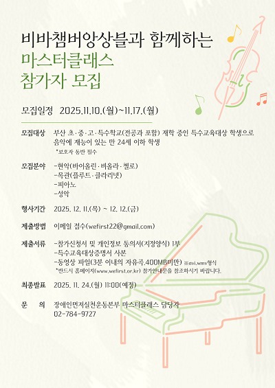 장애인먼저실천부산운동본부가 ‘비바챔버앙상블과 함께하는 마스터클래스 참가자’를 모집한다. 마스터클래스는 부산 지역의 음악 재능을 지닌 장애 학생을 발굴하고, 전문 연주자와의 만남을 통해 역량을 향상하기 위해 마련됐다.