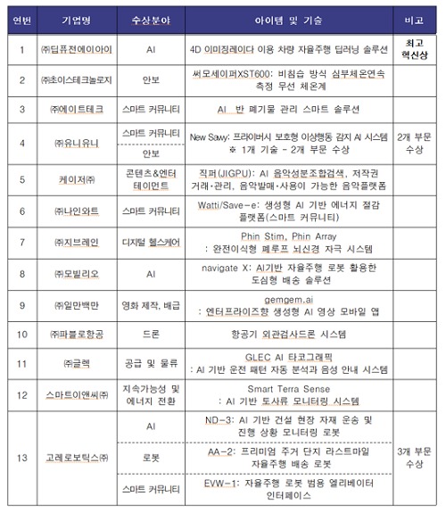특히 ▲㈜딥퓨전에이아이는 4D 이미징레이다를 이용한 차량 자율주행 딥러닝 솔루션 기술을 선보이며 AI(인공지능) 분야에서 최고혁신상을 받았다. ▲㈜유니유니는 New Savvy(프라이버시 보호형 이상행동 감지 AI 시스템)을 선보이며 스마트 커뮤니티, 모두를 위한 인간 안보(Products in Support of Human Security for All)의 2개 부문에서 혁신상을 받았다. ▲고레로보틱스㈜는 ND-3(AI 기반 건설 현장 자재 운송 및 진행 상황 모니터링 로봇), AA-2(프리미엄 주거 단지 라스트마일 자율주행 배송 로봇), EVW-1(자율주행 로봇 범용 엘리베이터 인터페이스)가 각각 인공지능, 로보틱스, 스마트 커뮤니티 3개 부문에 이름을 올렸다.