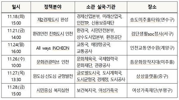 세부 일정은 ▲18일 경제산업본부, 미래산업국, 인천테크노파크, 신용보증재단 ▲21일 환경국, 시민안전본부, 상수도사업본부, 인천환경공단 ▲24일 교통국, 해양항공국, 인천교통공사 ▲26일 문화체육국, 국제협력국, 인천문화재단, 인천관광공사 ▲27일 글로벌도시국, 도시계획국, 도시균형국, 경제자유구역청, 인천도시공사 ▲28일 보건복지국, 여성가족국 순으로 진행될 예정이다.