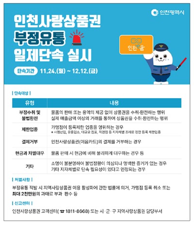 11월 24일부터 12월 12일까지 인천사랑상품권의 부정 유통을 방지하고 건전한 유통 질서를 확립하기 위해 일제 단속을 실시한다고 밝혔다.
