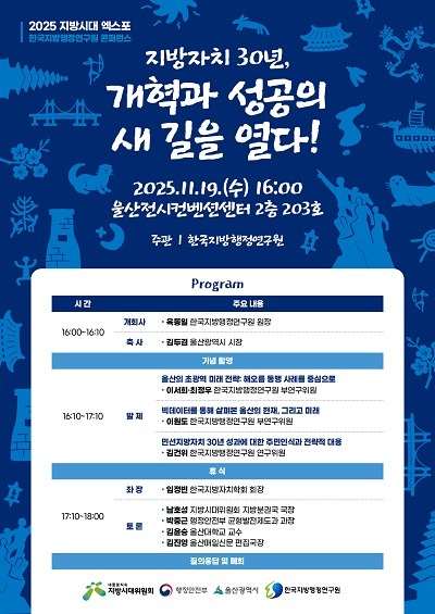 한국지방행정연구원(원장 육동일)은 11월 19일(수) 오후 4시 울산전시컨벤션센터(UECO)에서 ‘지방자치 30년, 개혁과 성공의 새 길을 열다!’를 주제로 특별 콘퍼런스를 개최한다. 본 행사는 ‘2025 대한민국 지방시대 엑스포’의 공식 프로그램 중 하나로, 지방자치 시행 30주년을 기념하고 향후 30년을 준비하기 위한 정책적 방향을 모색하는 뜻깊은 자리가 될 전망이다.