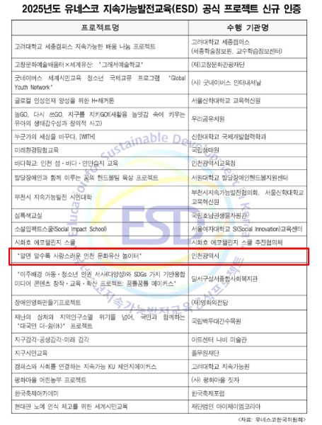 인천시는 지난 3년간 문화유산 도보탐방 사업의 일환으로 추진해 온 ‘알면 알수록 사랑스러운 인천 문화유산 놀이터’(이하 인천 문화유산 놀이터) 프로그램이 2025년 유네스코 지속가능발전교육(ESD) 프로젝트 신규 인증을 받았다고 밝혔다.