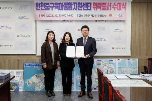 중구청은 지난 23일 오후 제2청 구청장실에서 한빛바른보육경영원과 ‘인천중구육아종합지원센터 위탁운영 계약’을 체결했다.