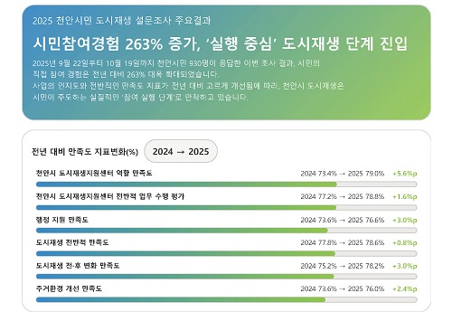 천안시 도시재생지원센터 오형석 센터장은 “센터의 역할에 대한 시민들의 긍정적인 평가가 실질적인 참여 경험이 263%로 상승하는 결과로 이어졌다”며 “2026년에도 시민이 사업의 주인공이 되는 참여의 장을 더욱 넓히고, 우리 동네의 변화를 생활 속에서 직접 체감하실 수 있도록 모든 역량을 집중하겠다”고 밝혔다.