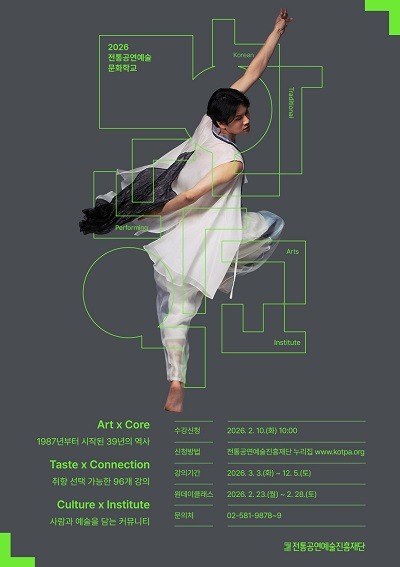 2026 문화학교 신규 수강 신청은 2월 10일(화) 오전 10시부터 전통공연예술진흥재단 누리집(www.kotpa.org)을 통해 온라인으로 진행된다. 강좌별 시간표와 접수 방법 등 자세한 내용은 재단 누리집에서 확인할 수 있다.