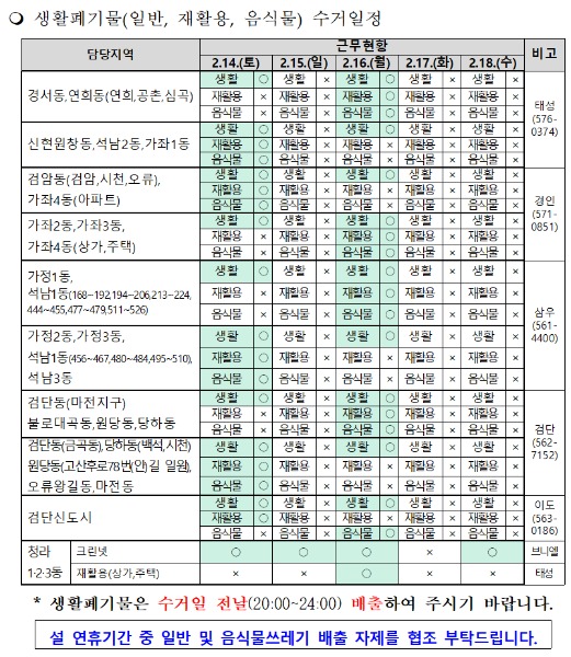 인천 서구(구청장 강범석)는 설을 맞아 연휴기간 동안 차질없는 쓰레기 관리로 쾌적한 명절분위기를 조성하고자 ‘설 연휴 생활폐기물 관리 종합대책’을 수립·추진한다.