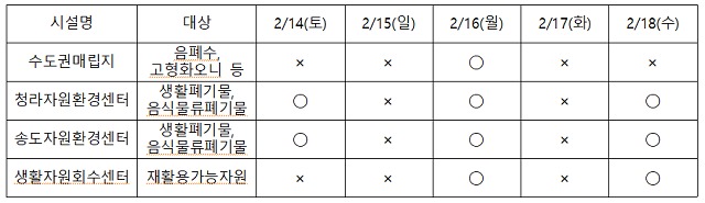 송도자원환경센터와 청라자원환경센터는 2월 15일(일)과 설 당일인 2월 17일(화)을 제외한 연휴 기간 동안 반입을 허용하며, 수도권매립지는 2월 16일(월) 하루에 한해 반입이 가능하다. 다만, 수도권매립지 반입은 공휴일 반입을 허용하는 것으로 직매립 금지 원칙은 현행대로 유지된다.