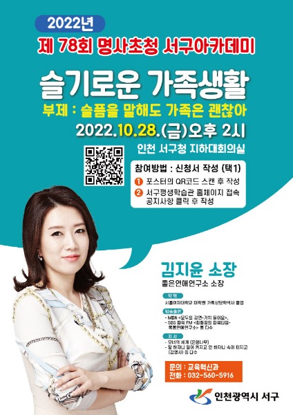 인천시 서구(구청장 강범석)는 오는 28일 김지윤 좋은연애연구소장을 초청, '슬기로운 가족생활'이라는 주제로 제78회 명사초청 서구아카데미를 진행한다고 밝혔다.