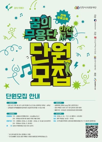한편, 단원 모집 접수는 2026년 2월 23일(월)부터 3월 13일(금) 24시까지 진행되며, 1차 서류심사와 2차 면접심사를 거쳐 최종 선발된다. 자세한 모집 내용과 지원 방법은 인천서구문화재단 홈페이지 및 홍보물 내 QR코드를 통해 확인할 수 있으며, 문의는 인천서구문화재단 문화예술교육팀(032-510-6072)으로 하면 된다.