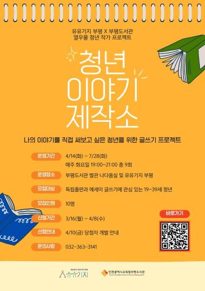 프로그램은 4월 14일부터 6월 9일까지 매주 화요일 총 8회차로 부평도서관에서 진행되며, 7월 28일에는 유유기지 부평 내 유유스페이스에서 약 2시간의 회고 모임이 열릴 예정이다.