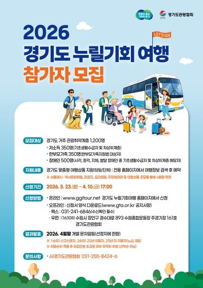 경기도가 3월 23일부터 4월 10일까지 관광취약계층의 무료 여행을 지원하는 ‘경기도누릴기회여행’ 참여자 1,200명을 모집한다.