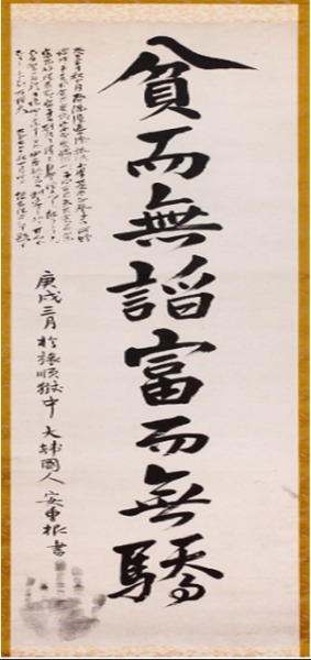 도쿠토미 로카는 이 유묵 왼편 상단에 '안중근 씨가 이 말을 택한 것은 자연스러운 일이라고 할 수 있다. 그가 빈락부예(貧樂富禮)의 경지에 이르렀다면 이토 히로부미의 자객으로 만족하지는 않았을 텐데 애석한 일이다'라고 적었다.
