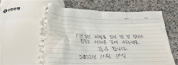 익명의 기부자는 본인의 신상이 밝혀지기를 극구 사양하면서 "1년 동안 어려운 이웃을 생각하며 조금씩 모았던 돈입니다. 날씨가 추워지는 만큼 도움이 필요한 이웃을 지원하는 데 쓰이기를 바랍니다"라며 정성스레 모은 기부금 봉투를 면사무소에 전달했다.
