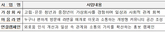 각 수행기관은 가상회사 참여자 모집과 우리동네 마음라면 전용 공간 조성 등 사업 운영 준비에 착수하는 한편, 연중 상시 전개되는 시민 참여형 챌린지와 지역사회 연계 이벤트 등 다양한 방식의 연결 캠페인을 통해 정책 홍보에 박차를 가할 계획이다.