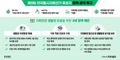 환경재단(이사장 최열) 어린이환경센터가 오는 6월 제9회 전국동시지방선거를 앞두고 자치단체장·교육감 후보자에게 정책 공약 채택을 촉구하는 ‘아동환경권 보장을 위한 기후안전 생활권 조성 정책 제안’을 발간했다.