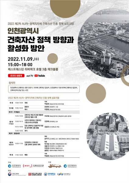 인천광역시(시장 유정복)는 오는 9일 베스트웨스트 하버파크호텔에서 건축공간연구원(원장 이영범)과 공동으로 주최·주관하는 '2022 제2차 AURI-광역지자체 건축자산 진흥 정책 심포지엄'을 개최한다고 6일 밝혔다.