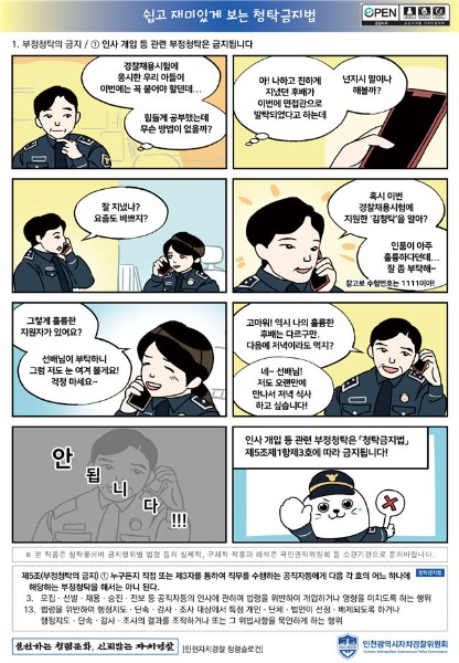 인천광역시 자치경찰위원회는 인천자치경찰의 청렴인식을 정립하고 청렴법령에 대한 이해도를 높이고자 '쉽고 재미있게 보는 청탁금지법'웹툰을 제작했다고 6일 밝혔다.